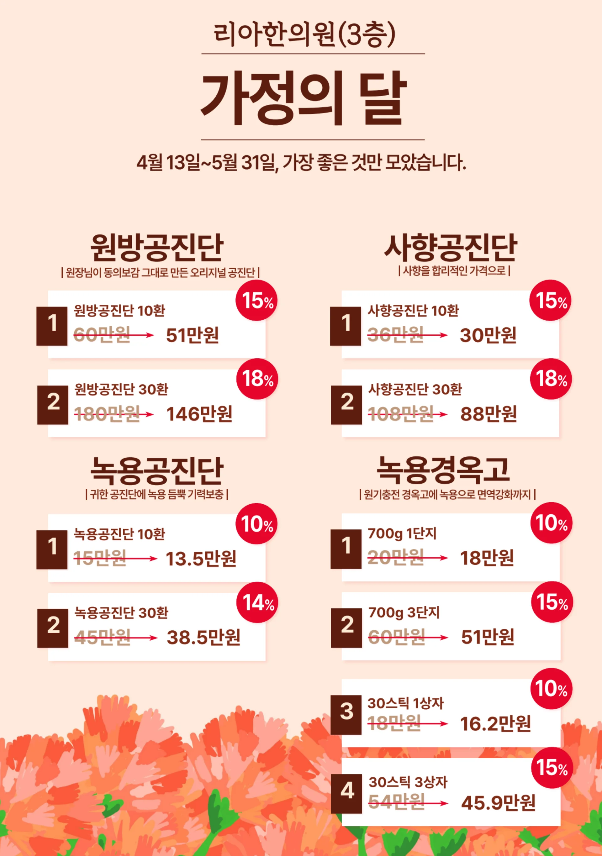 가족의 건강이 걱정되는 5월, 소중한 분들께 마음을 전할 가장 가치 있는 선물을 고민하고 계신다면 리아한의원이 준비한 공진단과 경옥고를 주목해 주세요. 수많은 보약 처방 중에서도 유독 이 두 가지가 시대를 초월해 사랑받는 데에는 그만한 이유가 있습니다.